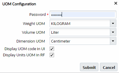 The Unit of Measure (UOM) UI gives you the flexibility to configure other UOMs in addition to the existing supported system class UOMs (cubed, cases, packs, pallets, LPNs, and units.)