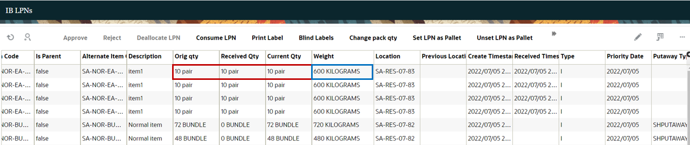 In this example, you can see that the quantities are appended with the corresponding primary UOM of the item. You can also see that the weight is appended with the corresponding UOM from the company/facility UOM configuration.