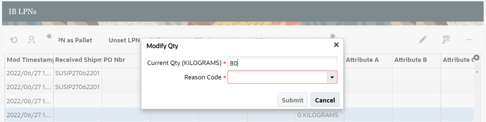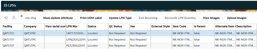 Certain pop-up screens have been modified to include the UOM code. In the following example, if you are modifying an Inbound LPN, as a user, you can more easily see the UOM associated with each Inbound LPN.