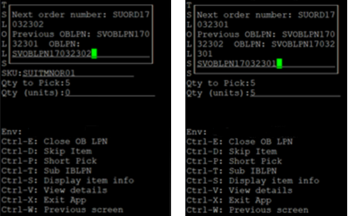When a task has multi order picks associated with it which requires multiple OBLPNs to be picked for multi-orders, upon picking for the 1st order, the next pick gets generated for a new order and prompts the user for a new OBLPN. However, the RF screen message covers up the OBLPN information detailing the inventory that was packed for the previous order. This was causing the floor user to pick the inventory into previous OBLPN as the previous OBLPN has been clouded by the message.