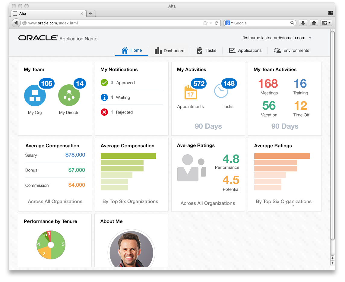 - The non-dashboard home page supports immediate task completion. It concentrates information and available actions in a highly correlated set of objects belonging to a single application.