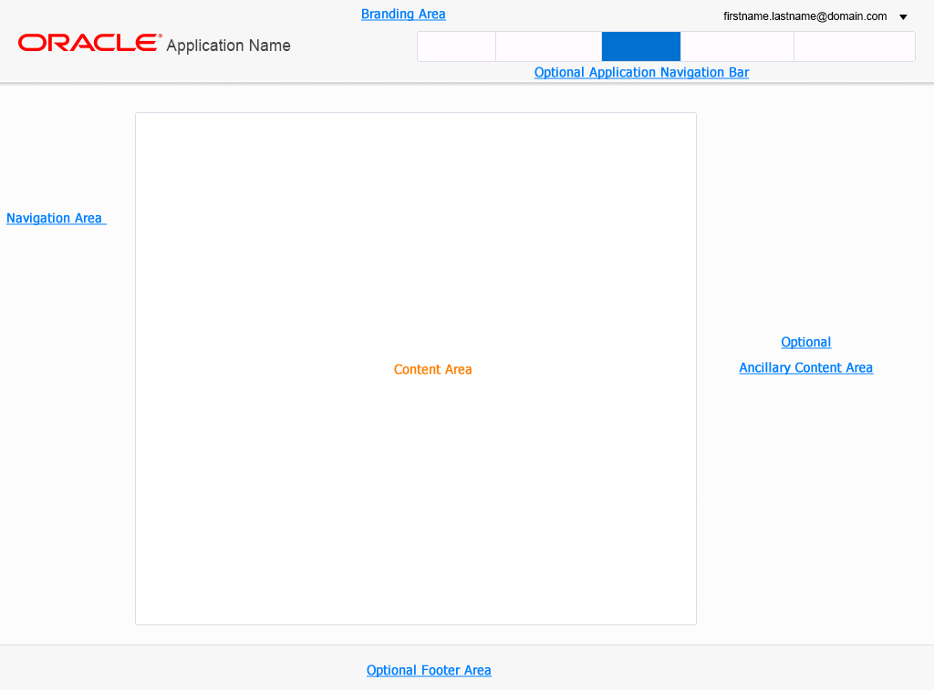The following illustrates the Branding Area and the Navigation Area in an Oracle Alta UI page.