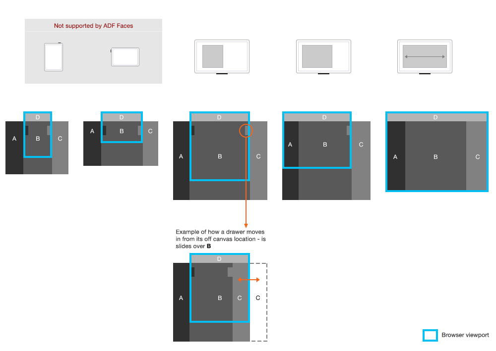 - The order in which peripheral or ancillary content content is repositioned into or out of a drawer, as well as the browser display width at which the repositioning occurs, is a design choice. The illustration given below gives priority to the left drawer content (most often navigation controls) at the desktop browser display width.