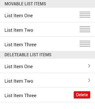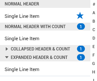 - Headers: If available, create groups of list items. Can contain an arrow that collapses or expands the group.