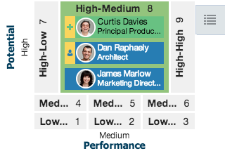 The Nbox component is used in HCM applications and measures each employee across two dimensions: potential and performance. Each of these dimensions is split into multiple ranges, whose intersections result in distinct cells into which each employee can be placed. An Nbox component consist of the following elements: