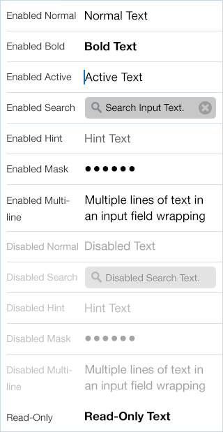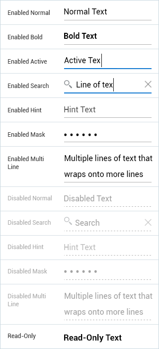 - State: Supports enabled, pressed, disabled and read-only.